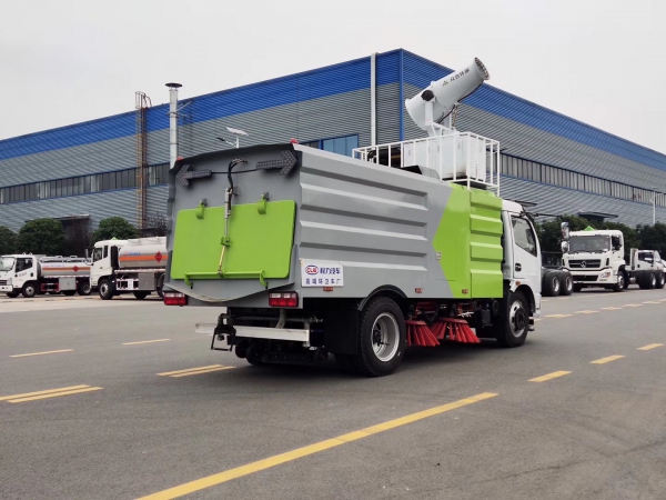 后噴霧:在洗掃車后部垃圾箱下方配有噴霧噴桿,噴霧噴桿上裝有多個(gè)噴霧噴嘴。啟動(dòng)副發(fā)動(dòng)機(jī)和高壓水泵,打開后噴霧開關(guān),啟動(dòng)底盤車前行,就可進(jìn)行噴霧降塵作業(yè)。